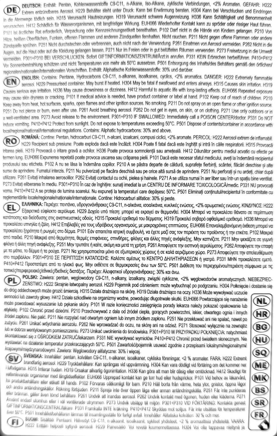 ZAWlERA: pentan, węglowodory C9-C11, n-alkany, izoalkany, cykliczne, poniżej 2% związków aromatycznych. NIEBEZPIECZEŃSTWO H222 Skrajnie łatwopalny aerozol. H229 Pojemnik pod ciśnieniem: może wybuchnąć po ogrzaniu. H304 Połknięcie i dostanie się do dróg oddechowych może grozić śmiercią. H315 Działa drażniąco na skórę. H336 Może wywoływać uczucie senności lub zawroty głowy. H412 Działa szkodliwie na organizmy wodne, powodując długotrwałe skutki. EUH066 Powtarzające się narażenie może powodować wysuszanie lub pękanie skóry. P101 W razie konieczności zasięgnięcia porady lekarza należy pokazać opakowanie lub etykietę. P102 Chronić przed dziećmi. P210 Przechowywać z dala od źródeł ciepła, gorących powierzchni, iskier, otwartego ognia i innych źródeł zapłonu. Nie palić. P211 Nie rozpylać nad otwartym ogniem lub innym źródłem zapłonu. P251 Nie przekłuwać ani nie spalać, nawet po zużyciu. P261 Unikać wdychania aerozolu. P262 Nie wprowadzać do oczu, na skórę ani na odzież. P271 Stosować wyłącznie na zewnątrz lub w dobrze wentylowanym pomieszczeniu. P31 Unikać uwolnienia do środowiska. P301+P310 W PRZYPADKU POŁKNIĘCIA: natychmiast skontaktować się z OŚRODKIEM ZATRUĆ/lekarzem. P331 NIE wywoływać wymiotów. P410+P412 Chronić przed światłem słonecznym. Nie wystawiać na działanie temperatur przekraczających 50°C /122°F. P501 Zawartość/pojemnik usuwać do miejscowej utylizacji zgodnie z przepisami krajowymi/międzynarodowymi. Zawiera: Węglowodory alifatyczne powyżej30% i więcej.